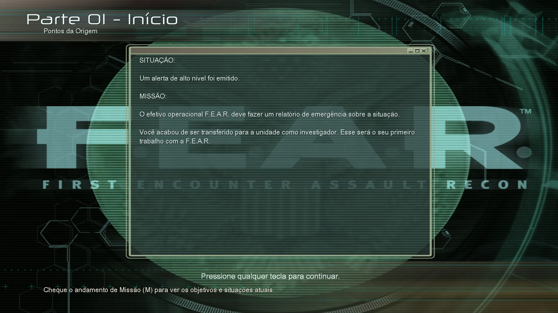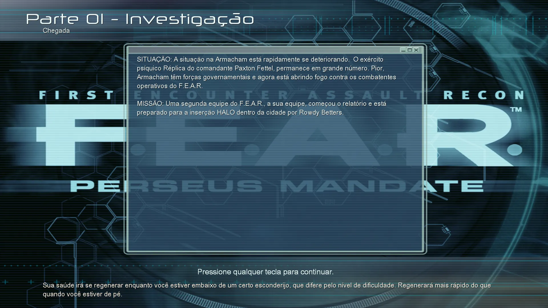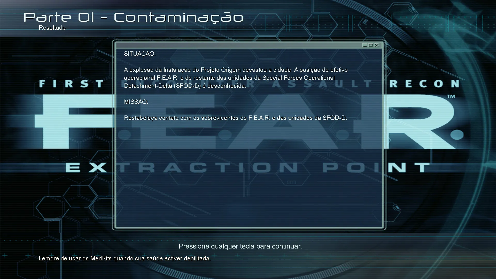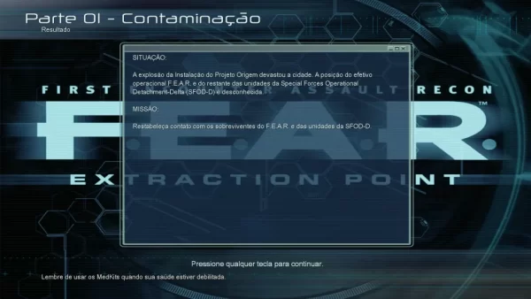 ATENÇÃO: Este patch de tradução deve ser aplicado na versão original 1.00 à 1.08 ou Steam (F.E.A.R), 1.00 ou Steam (Extraction Point) 1.0 ou Steam (Perseus Mandate). A dublagem creio que funcione em qualquer versão. Basta seguir os passos do instalador ou arquivo com instruções.