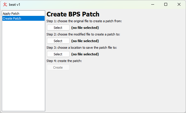 beat é a melhor ferramenta (pra mim) para aplicação e criação de patchs em formato .bps, além também de aplicar patch .bpm. O formato .bps foi idealizado como um sucessor do formato .ips. Os patches .bps suportam arquivos de qualquer tamanho, ao contrário do .ips, que é limitado a arquivos de 16 MB ou menos. Descanse em paz Near.